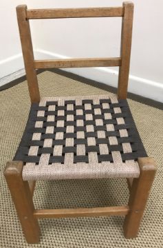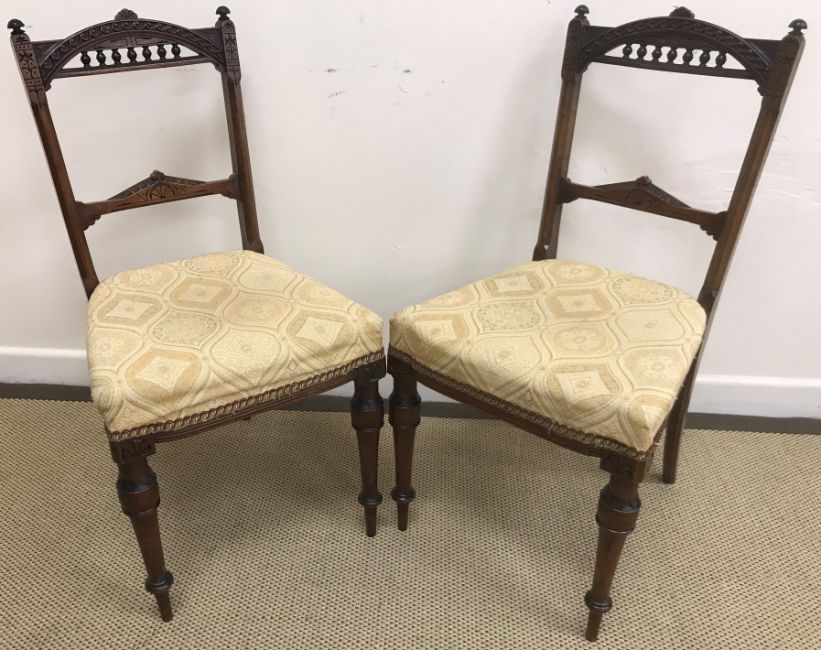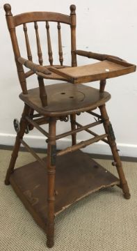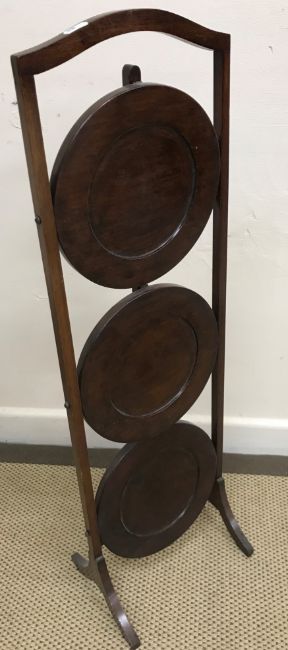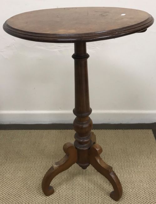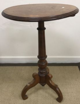 A burr walnut veneered occasional table, the circular top on a stained beech turned centre pedestal to scrollwork tripod base 49 cm diameter x 75.5 cm high, a Victorian upholstered dressing stool on turned supports united by a galleried under tier, two further stools, two childrens' chairs, a stained beech child's highchair, a pair of salon chairs with carved backs and upholstered seats, a bentwood chair with figural decorated seat and a three tier folding cake stand