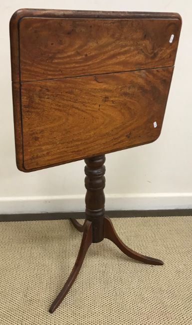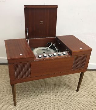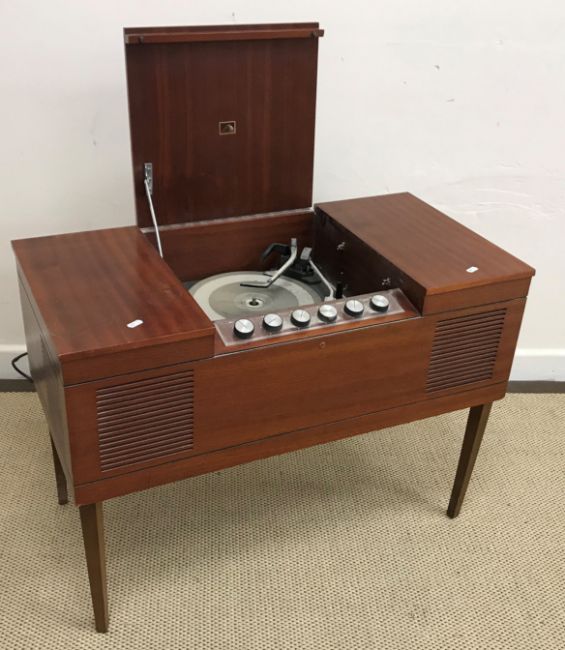 A collection of furniture comprising an Edwardian mahogany and inlaid gramophone cabinet, the top section with hinged lid opening to reveal an empty space above two cupboard doors as a bank of six drawers above a further pair of cupboard doors opening to reveal a fitted interior for music raised on square tapering legs to spade feet and brass caps and castors 66 cm wide x 121 cm high x 64 cm deep together with a mahogany tilt top table, the rectangular top above a turned pedestal to tripod feet 48 cm wide x 73 cm high x 59 cm long and HMV mahogany record case containing a Garrard record player 84 cm wide x 60.5 cm high x 42.5 cm deep