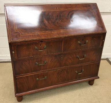 An early 19th Century mahogany bureau, the plain top above a rosewood cross-banded and satinwood strung fall front enclosing a fitted interior with various drawers, pigeon holes, central cupboard door, deed drawers, secret drawers, etc, over two short and three long graduated drawers with brass swan neck handles, raised on turned feet, 106.5 cm wide x 54 cm deep x 107.5 cm high