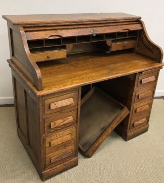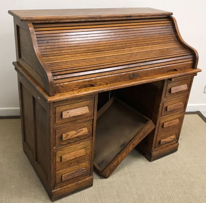 An early 20th Century oak tambour top desk with basic fitted interior over a central drawer flanked by two banks of slides over four drawers, 122 cm wide x 66.5 cm deep x 112 cm high