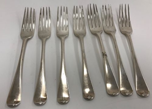 A set of seven Georgian silver "Old English" pattern dessert forks, all initialled "M" to handle (by Edward Lees London 1804, 1805 and 1806), total weight 7.5 oz