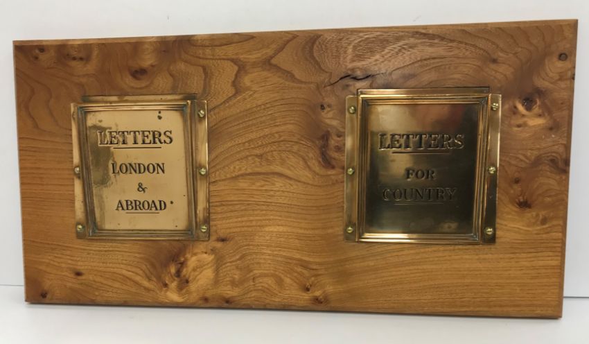 A pair of elm mounted brass "Letter pockets/racks" one inscribed "Letters London and Abroad", the other "Letters for Country" 30.5 cm high x 61 cm long