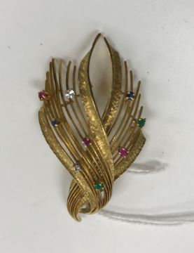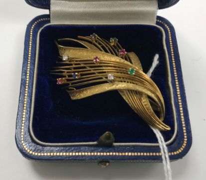 A mid 20th Century 18 carat gold brooch of spray form, set with 2 small diamonds , 2 sapphires, 2 emeralds and 3 rubies, total weight approx. 10 g, 5.5 cm long