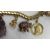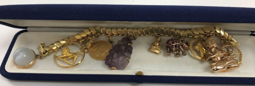 An 18 carat gold bracelet set with various charms to include a 14 carat gold Buddha, 9 carat gold elephant set with pink sapphires, a gold mounted carved purple amethyst figure of Ganesh, a gold 20 Franc piece dated 1914, various other yellow metal charms, total weight 122 g