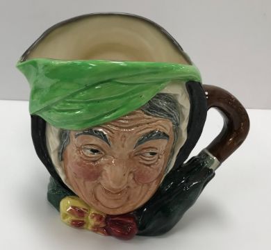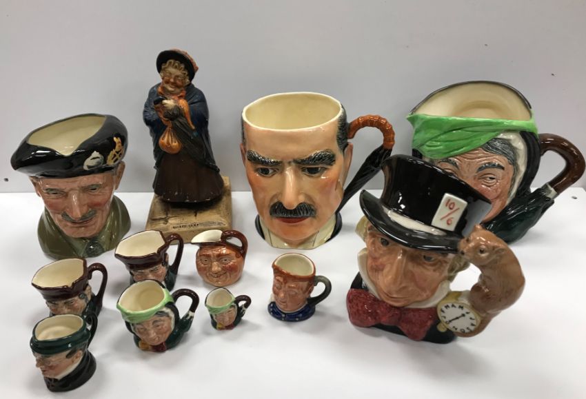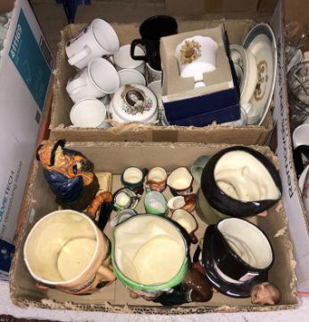 A box containing a Fieldings musical character jug of "Neville Chamberlain", together with various Royal Doulton character jugs to include "Sairey Gamp", "Monty", "Mad Hatter" (D6598) as well as various miniature character jugs, a Bretby figure of "Sairey Gamp" and a box of commemorative wares