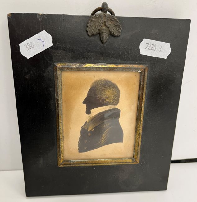 19TH CENTURY ENGLISH SCHOOL IN THE MANNER OF JOHN MIERS "Silhouette study of gentleman with white collar", 8 cm x 6.5 cm, housed in an ebonised frame, 16 cm x 14 cm