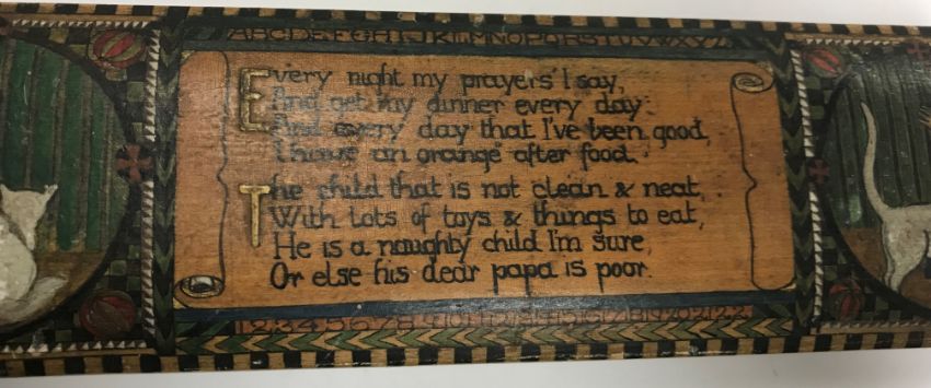 A circa 1900 hand-painted pen or glove box decorated in the style of Mabel Lucie Attwell or similar, bearing medallions depicting figures with white cats and various children playing to the sides, the top with inscription "Every night my prayers I say and get my dinner every day...", bearing seal mark to base of young girl seated with box on her lap, inscribed to the interior "This pencil box belongs to me Nora Heap", containing a white metal page marker and two pens
