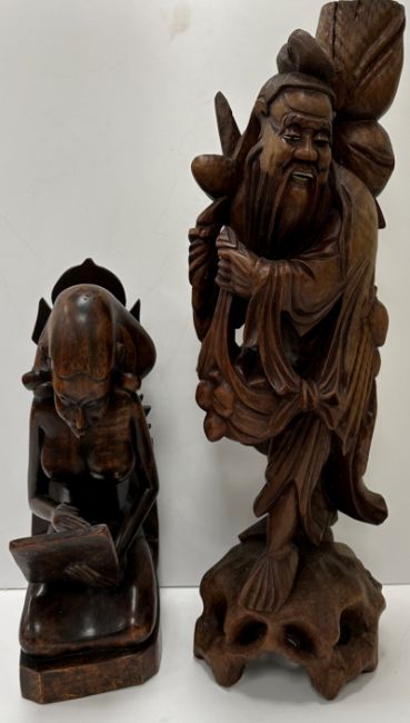 An Eastern carved hardwood figure of a bearded gentleman with staff and peaches 53.5 cm high and an Indonesian carved treenware figure of a kneeling woman 32.5 cm high