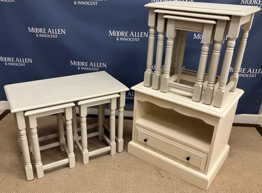 Two modern pale grey painted nests of occasional tables and a cream painted bedside table
