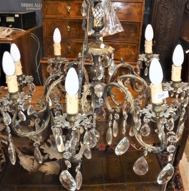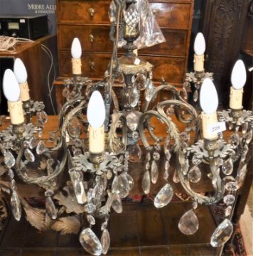 A French brass eight branch electrolier with hanging lustre drops 108 cm long