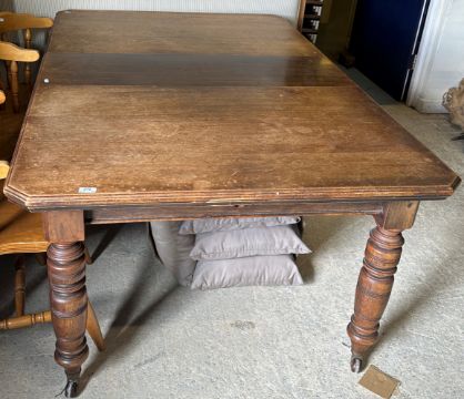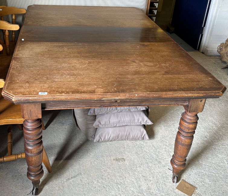 Whilst table is basically sound, there is wear and tear conducive with age and use throughout. Leaf different in colour to the rest of the table suggesting that not often used or re-stained at some point. Leaf is 35 cm wide therefore length of table without leaf i.e. minimum length 141 cm. See images for further detail.