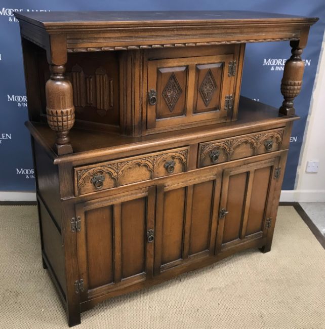 A Victorian walnut rectangular extending dining table, the top with moulded edge on turned and ringed supports to castors, 176 cm long x 114 cm wide x 73 cm high, together with a 20th Century oak court cupboard in the 17th Century style, the upper section with lozenge panel door flanked by canted linenfold panels on acorn carved supports on a base of two drawers over two cupboard doors on stile supports 127 cm wide x 48.5 cm deep x 131.5 cm high