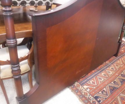 A pair of modern stained wooden headboards in the 19th Century French manner, each with turned side column decoration and serpentine tops, over the cross-banded main headboard, 220 cm wide x 181 cm high