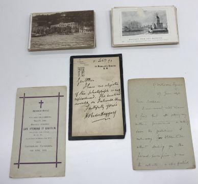 A collection of various ephemera including a letter from Henry Rider Haggard on 24 Redcliff Square headed paper, dated 5 February 90 "Gentlemen - I have no objection if the photograph is well produced. The enclosed would do I should think. Faithfully yours H Rider Haggard", another letter from L Huxley dated 27 June 1911, an Order of Service for The Memorial Service for The Late Field Marshall Horatio Herbert Earl Kitchener of Khartoum 13th June 1916 and a small quantity of various postcards depicting various British and Continental scenes including Venice, the Parthenon, the New Church at Margate, Holywell sand dunes, etc, etc.