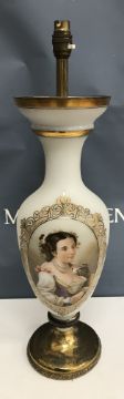 A circa 1900 frosted milk glass vase shaped table lamp decorated with portrait bust of a Spanish beauty in pearl necklace raised on a lacquered brass circular foot 63 cm high over all including bayonet fixing