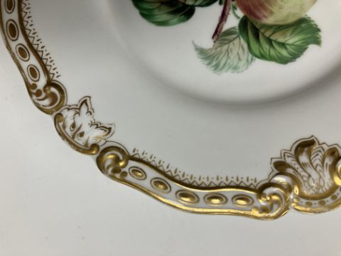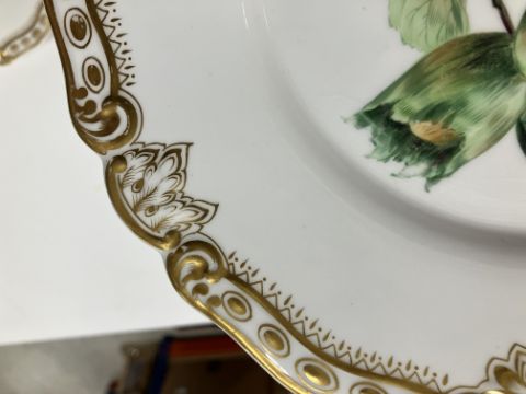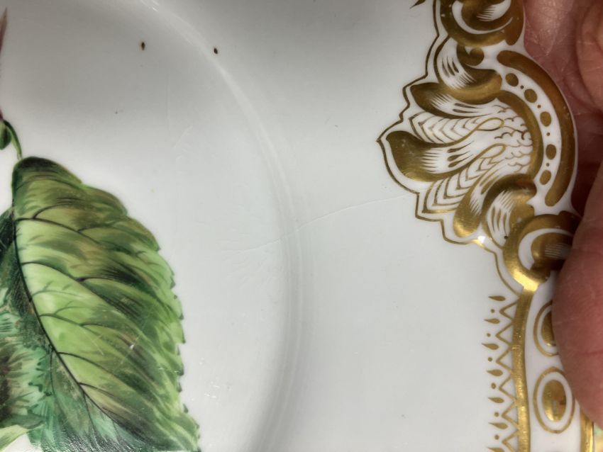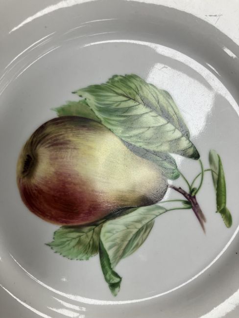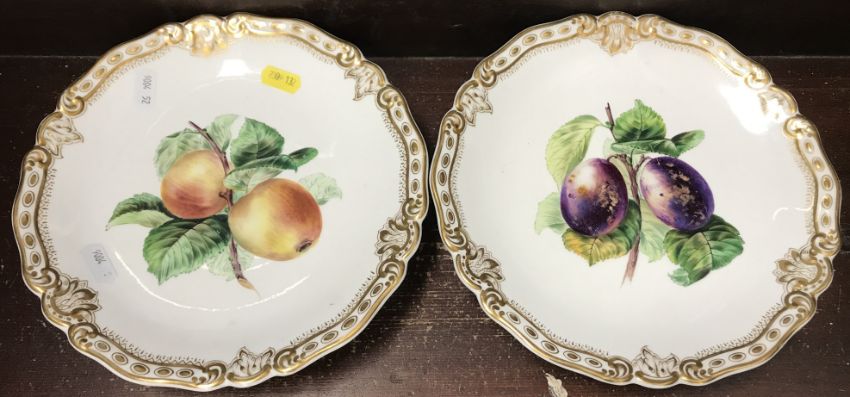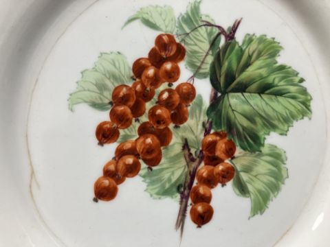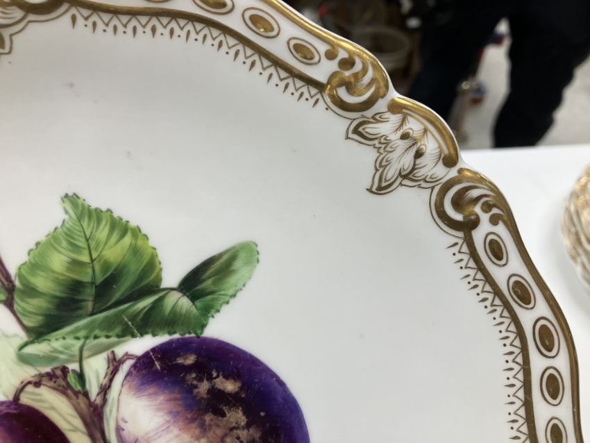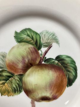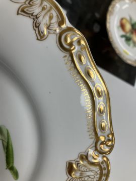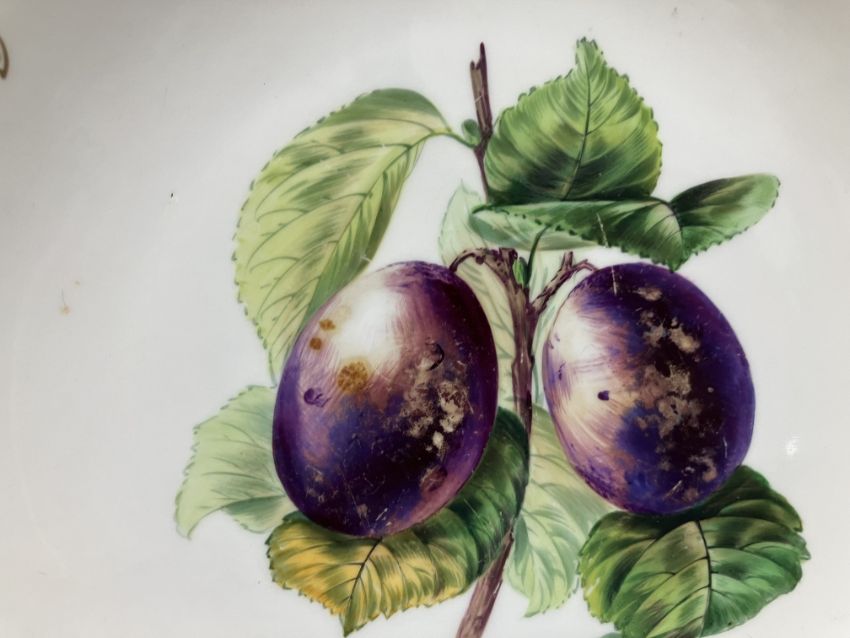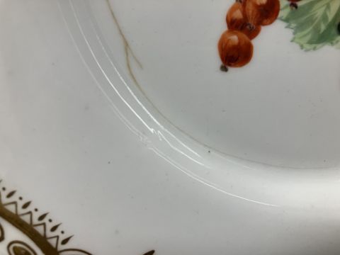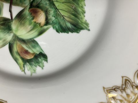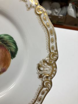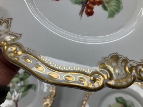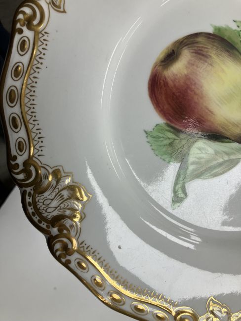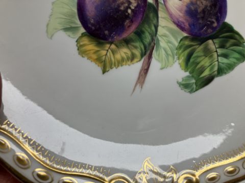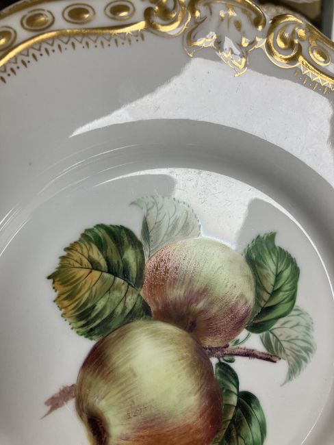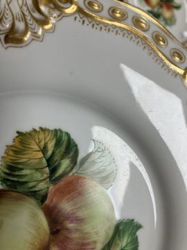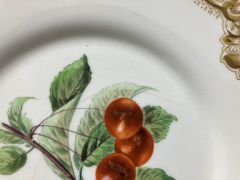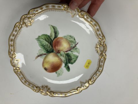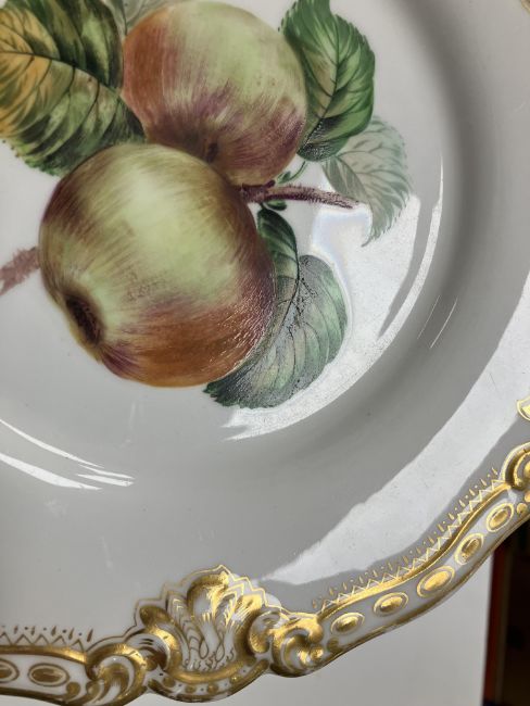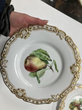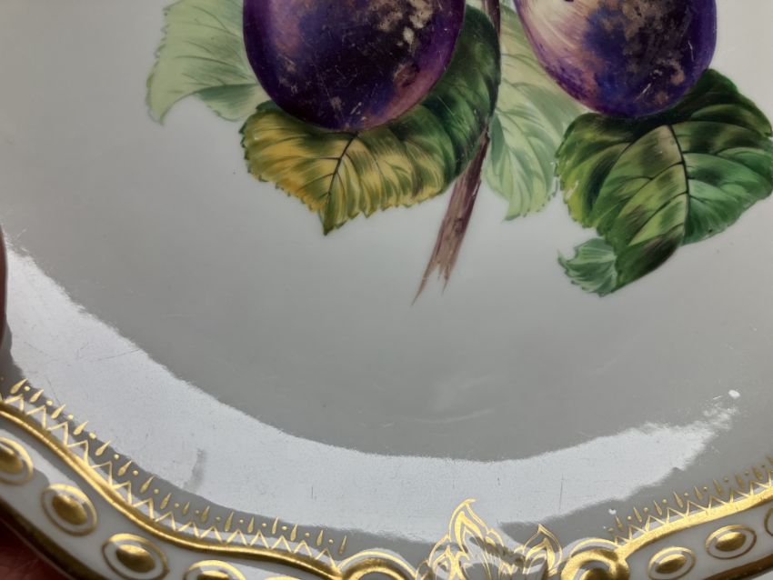 The plate with cherries has a large hairline crack and crazing throughout. The plate with redcurrants has several large hairline cracks, various chips and crazing. The cobnut plate again heavily cracked and crazed throughout and with chips. The apple plate has surface scratching variously and losses to the gilding. The pear plate - has surface scratching and losses to the gilding. The apple decorated tazza has discolouration and surface scratching and couple of firing faults. The plum tazza has severe discolouration to the plums, surface scratching, etc. All items with general wear and tear conducive with age and use to include surface scatches, wear to the gilding and enamel work. In need of a good clean. See images for further detail.