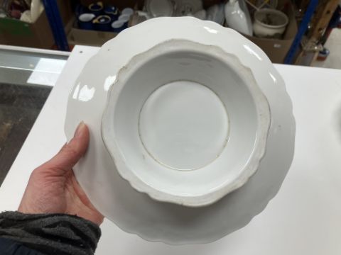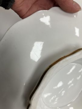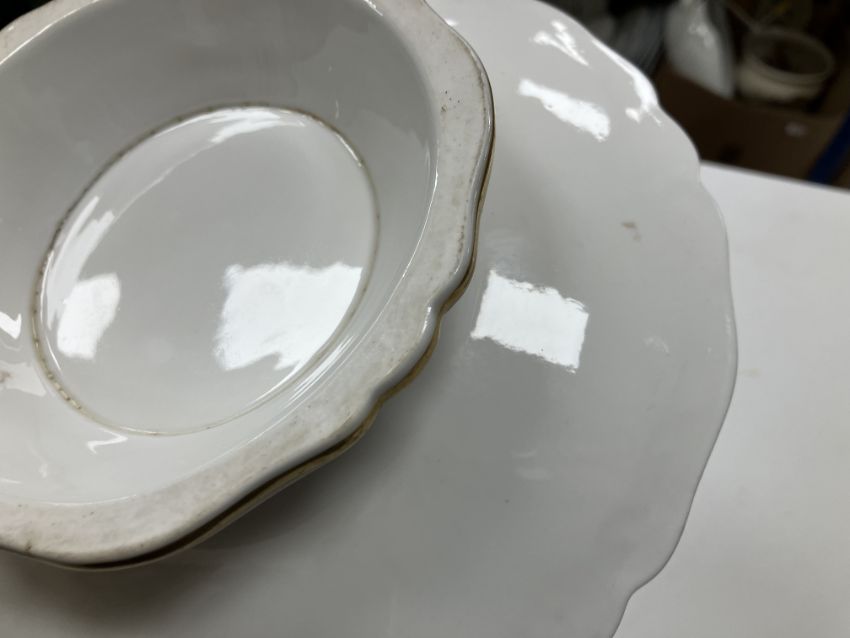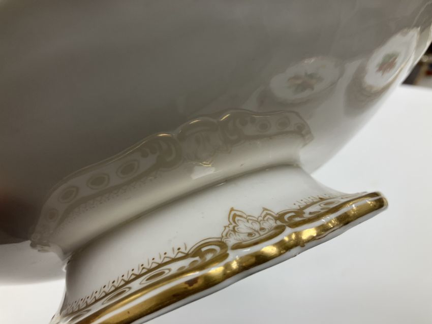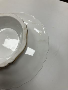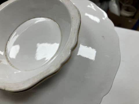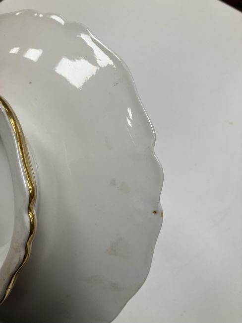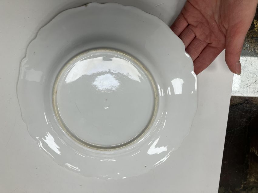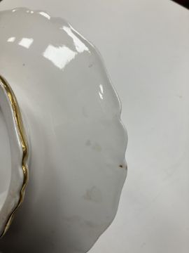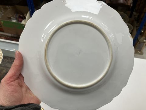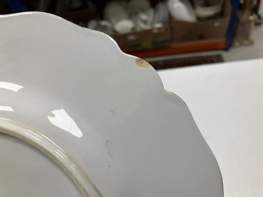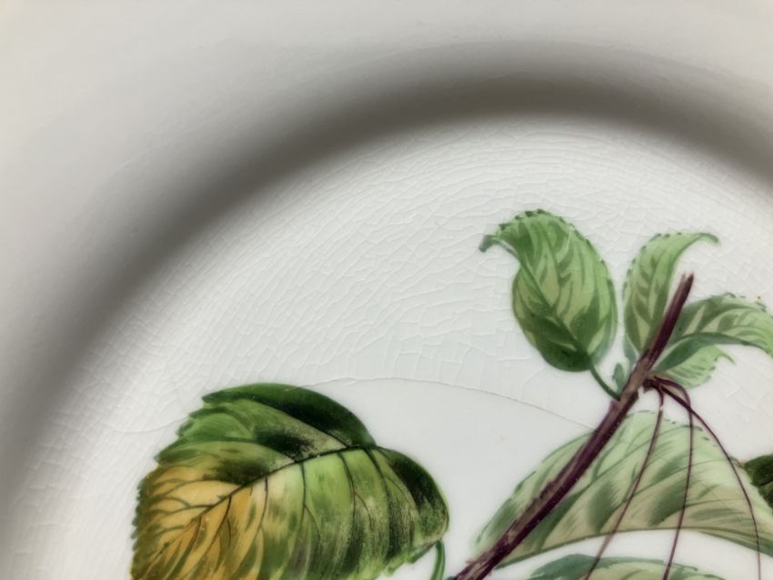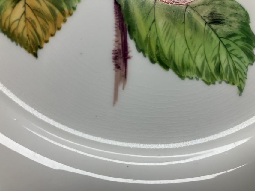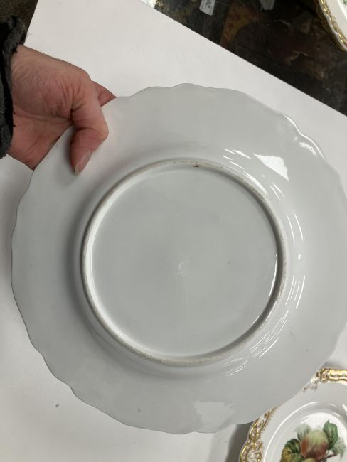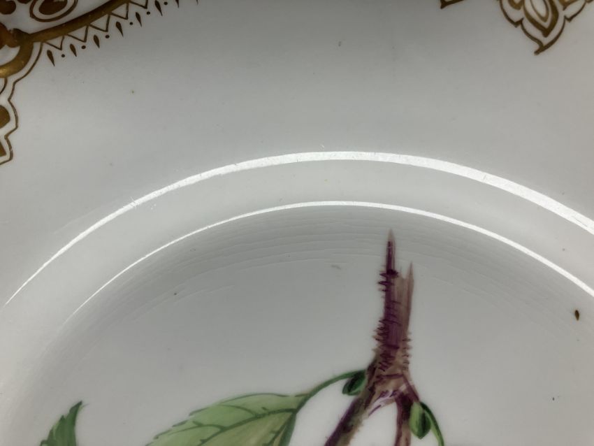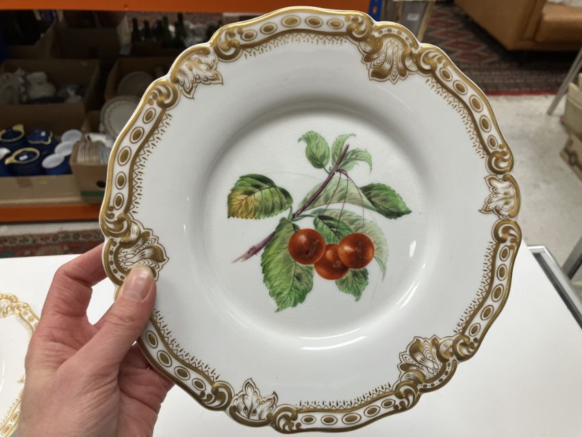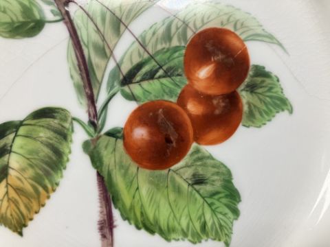 The plate with cherries has a large hairline crack and crazing throughout. The plate with redcurrants has several large hairline cracks, various chips and crazing. The cobnut plate again heavily cracked and crazed throughout and with chips. The apple plate has surface scratching variously and losses to the gilding. The pear plate - has surface scratching and losses to the gilding. The apple decorated tazza has discolouration and surface scratching and couple of firing faults. The plum tazza has severe discolouration to the plums, surface scratching, etc. All items with general wear and tear conducive with age and use to include surface scatches, wear to the gilding and enamel work. In need of a good clean. See images for further detail.