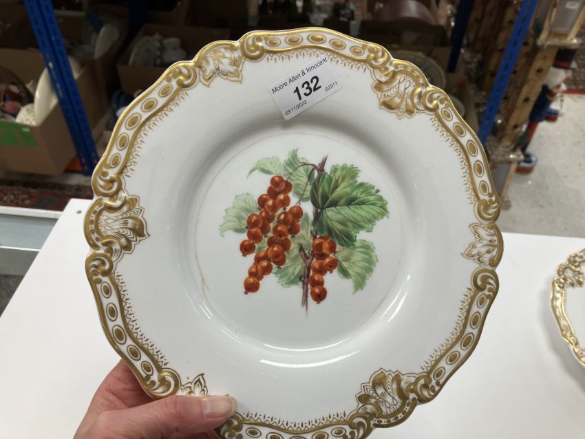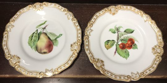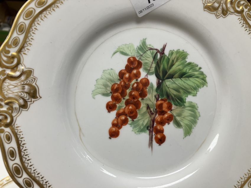 A 19th Century Worcester dessert service comprising two tazzas and five plates, each individually hand painted with fruit including apples (x2), pears, redcurrants, cherries, hazelnuts and plums within shaped gilt decorated borders, bear impressed marks to base, 24 cm diameter