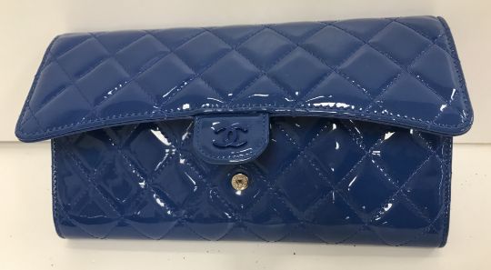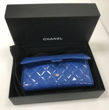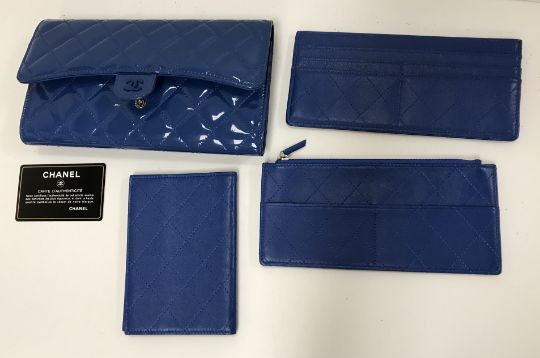 A patent blue Chanel travel clutch bag with passport holder, card holder etc, authenticity card no. 17154853, dust bag and box