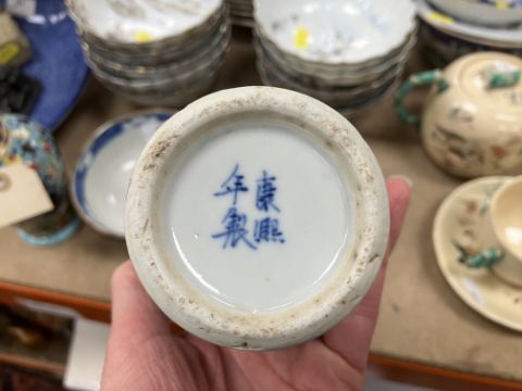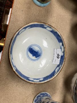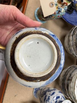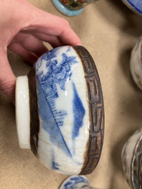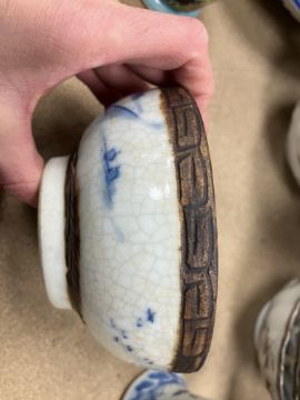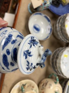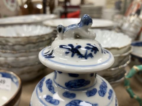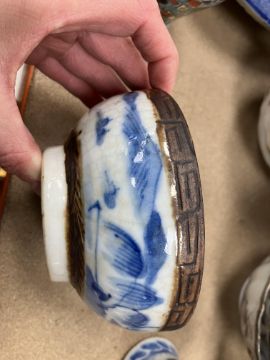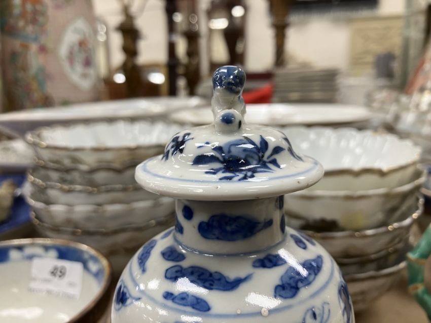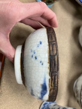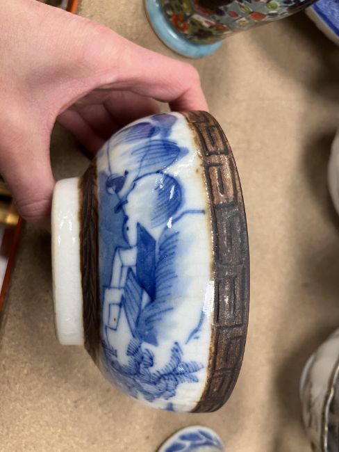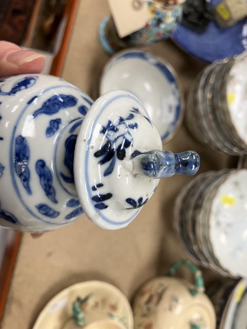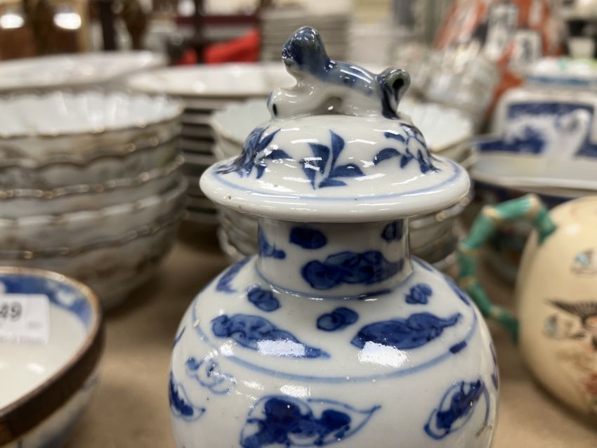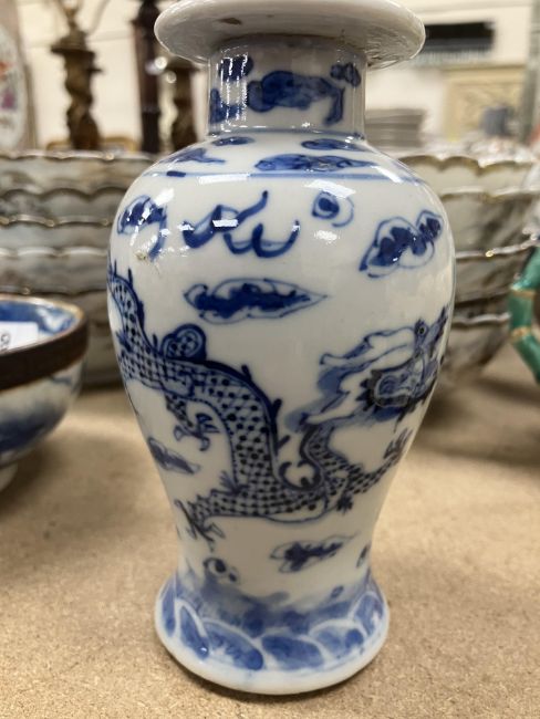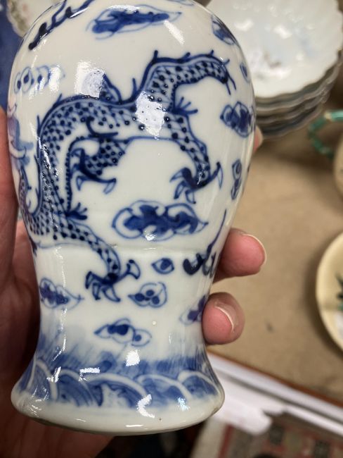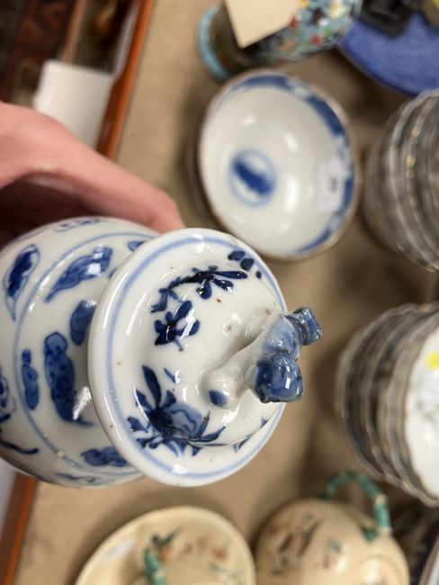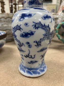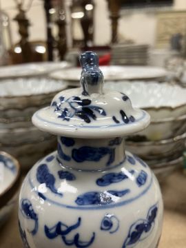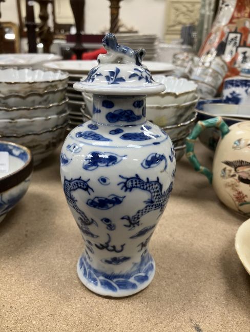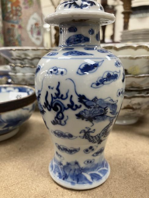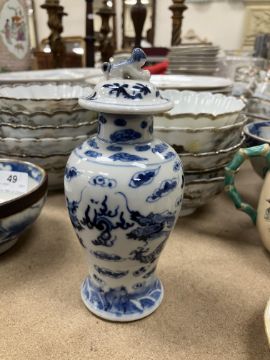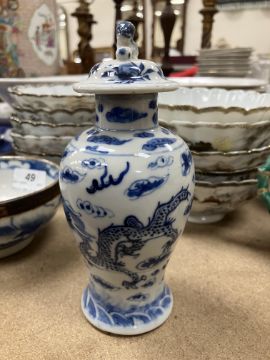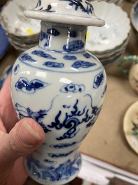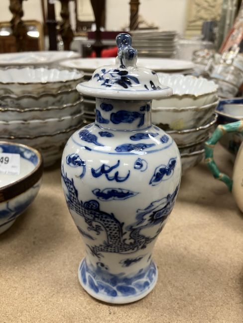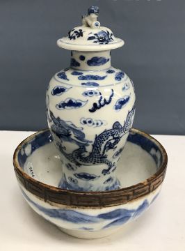 A Chinese blue and white baluster shaped vase and cover, the domed top with Dog of Fo finial over a four toed dragon decorated main body raised on a circular foot, bears four character Kangxi mark to base 16 cm high together with a Chinese blue and white crackle glazed bowl with matt brown incised banding raised on a circular foot 12.5 cm diameter x 6 cm high