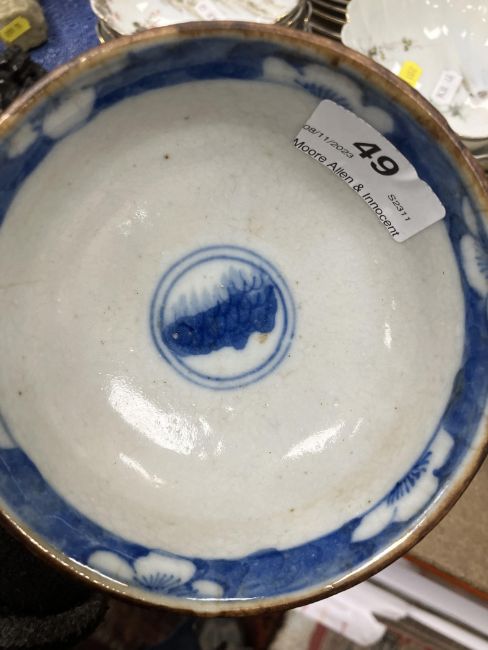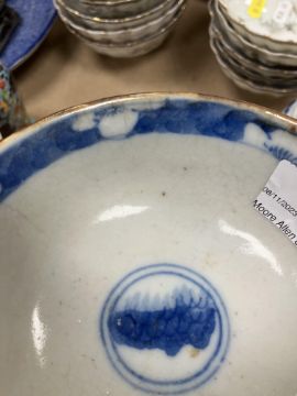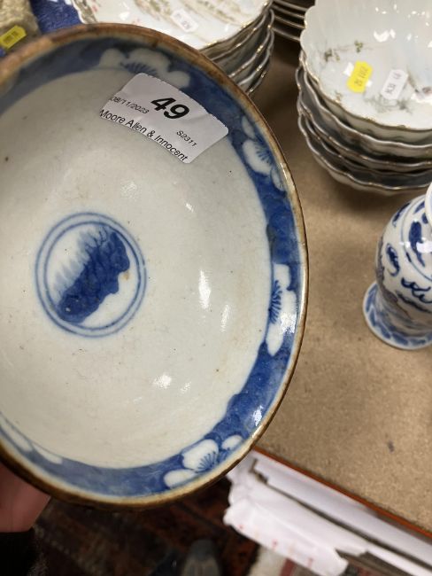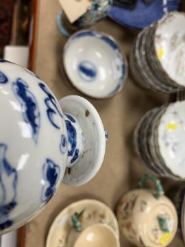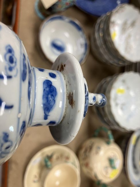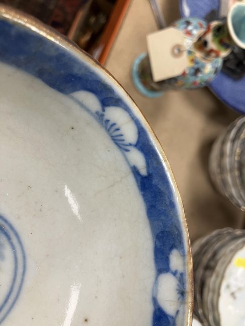 The vase and cover: the cover is stuck to the vase. - unknown if this is through glue or glaze however there is a yellowish bubblyish substance showing so more inclined to think glue. Otherwise dirty, in need of a clean, firing faults etc. The bowl has some hairline cracks, knife marks, firing faults etc. Both pieces have general wear and tear conducive with age and use - see images for more detail