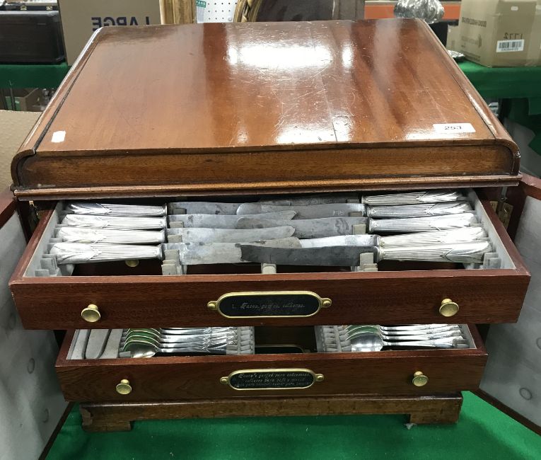 A mahogany cased WMF canteen of EPNS cutlery with steel blades and semi-reeded handles, stamped with maker's mark, together with various cutlery, salts, knife rests, carving set, etc, including eleven table forks, twelve dessert forks, eleven tablespoons, eleven teaspoons, fruit serving spoon, further serving spoon, four fish knives and forks, fish serving knife and fork, twelve gilt-washed fruit spoons, variously with WMF impressed marks including ostrich within a lozenge and "WMF60", WMF90", "WMF5", "WMF4", "WMF18", etc, case size 52.5 cm wide x 41 cm deep x 43 cm high