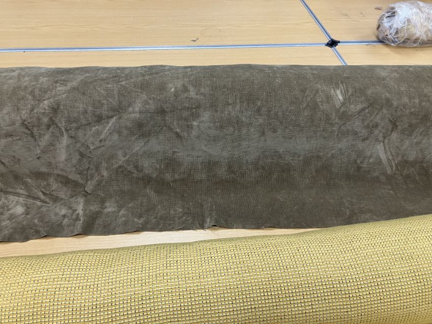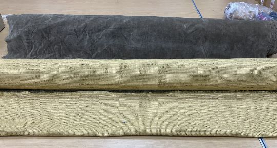 A remnant roll of furnishing velvet in mushroom together with a remnant roll of furnishing tweed type fabric in gold and brown