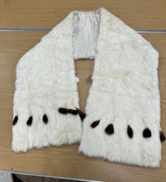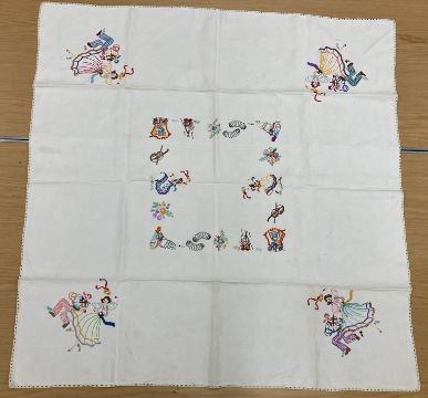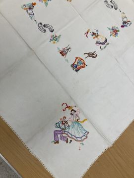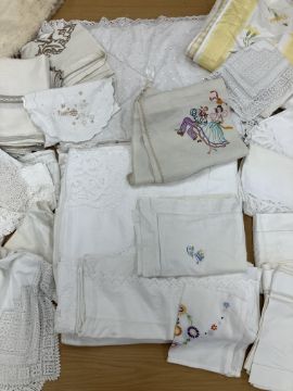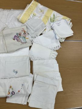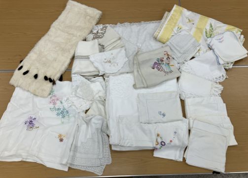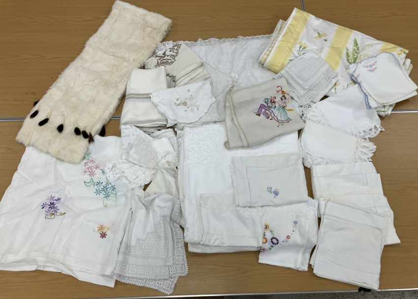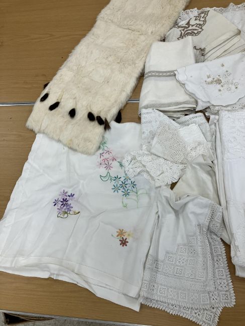 A box containing an ermine wrap together with assorted vintage bedding and table linens to include a table cloth with embroidered tarantella style decoration