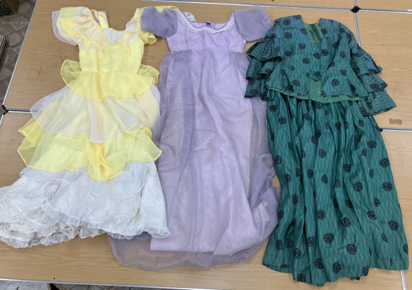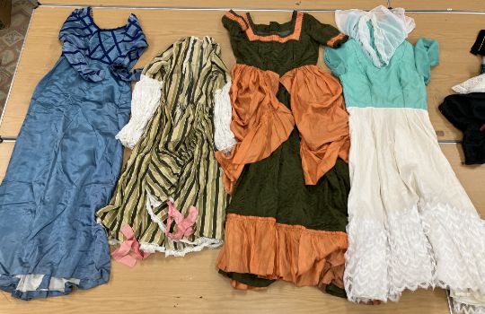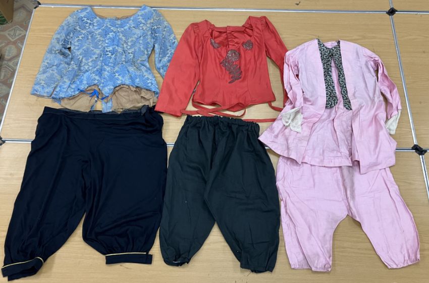 A box containing assorted theatre costumes to include dresses in the 18th to 20th Century styles, breeches etc (1 box)