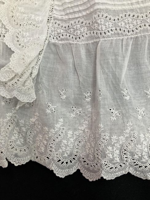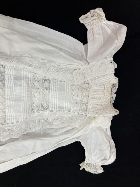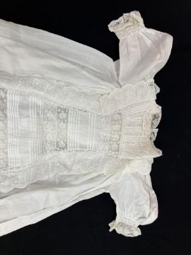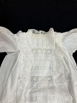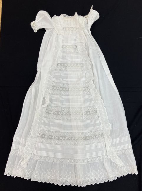 A circa 1900 Honiton type lace Christening gown with floral and foliate decoration and fine work to the central panel and hem line together with a small quantity of crocheted table linens etc (1 box)