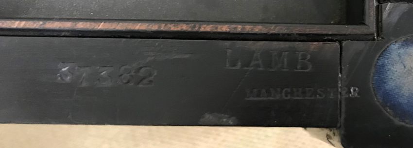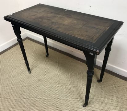 A 19th Century ebonised fold over card table by Lamb of Manchester, the top with tooled leather insert and moulded edge opening to reveal a green baize lined surface within a tooled and gilded leather border swivelling to reveal a recess bearing stamp "Lamb Manchester 37382" above a slender moulded frieze raised on slender turned and reeded supports to brass caps and castors 91 cm wide x 45.5 cm deep x 73 cm high