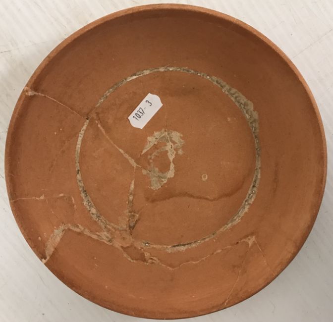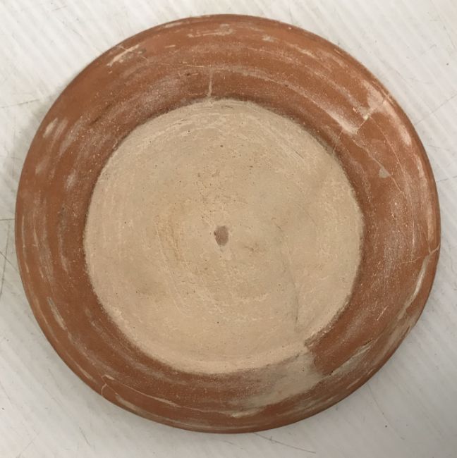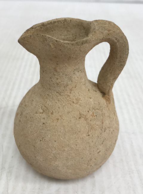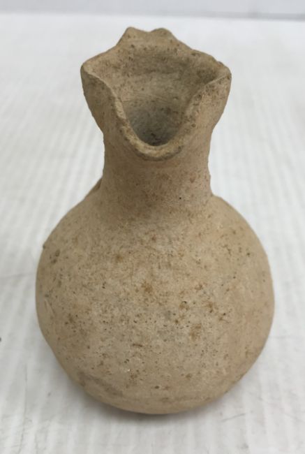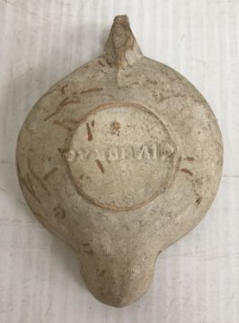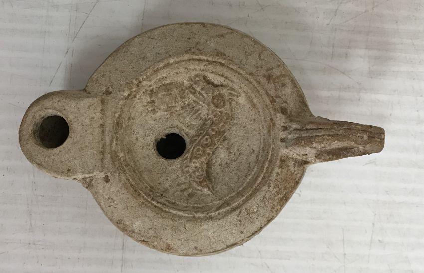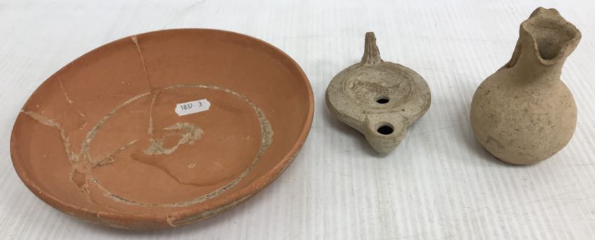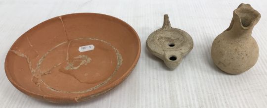 A Roman style pottery oil lamp with serpent decoration to top and impressed mark to base 10 cm long together with a similar miniature ewer 9 cm high and a terracotta dish of plain circular form, heavily restored (3)