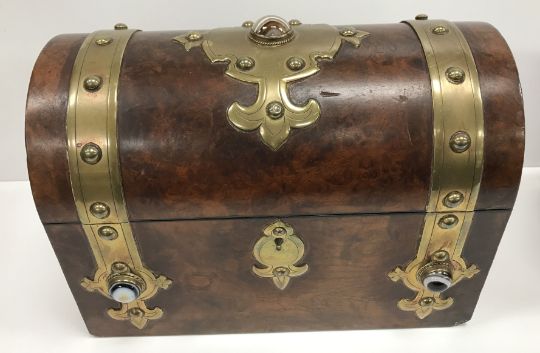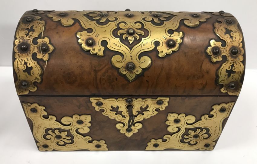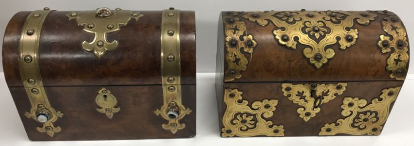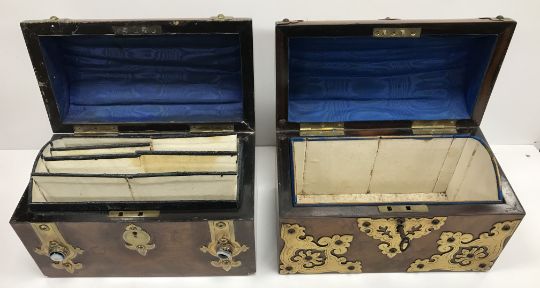 A Victorian walnut and brass bound dome top stationery box set with hardstone / onyx roundels, opening to reveal a fitted interior, 23.5 cm wide x 13.5 cm deep x 17.5 cm high, together with another similar walnut and brass bound dome top stationery box, the fitted interior missing, 24 cm wide x 13 cm deep x 16 cm high (2)