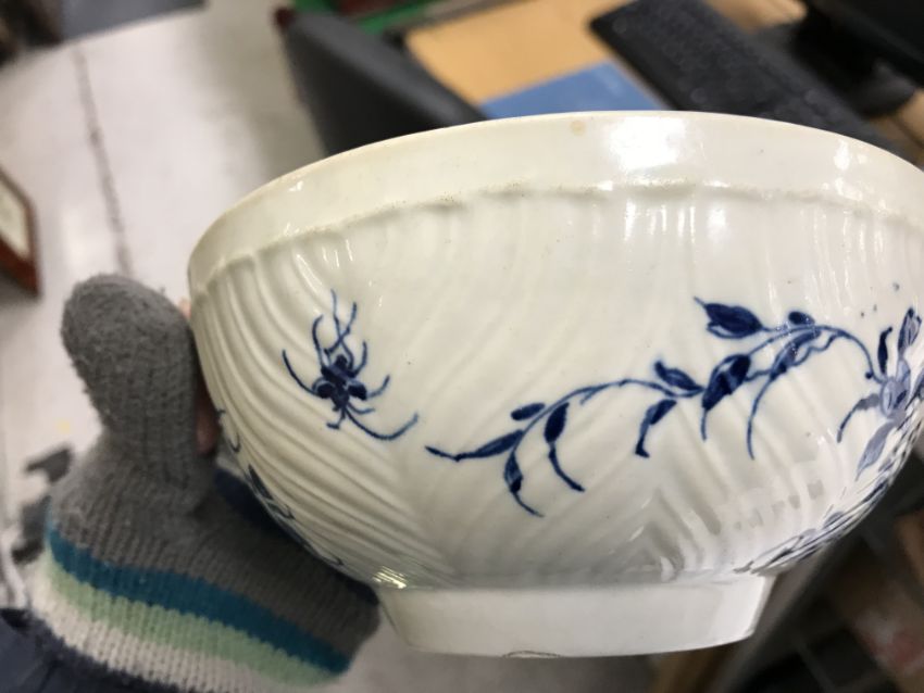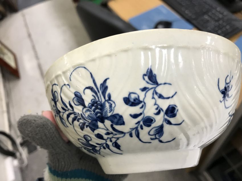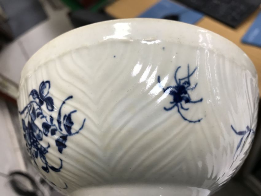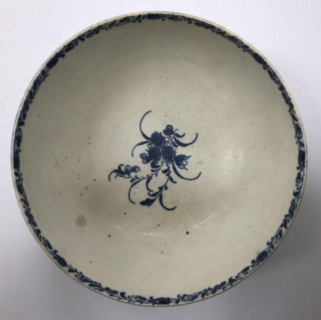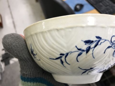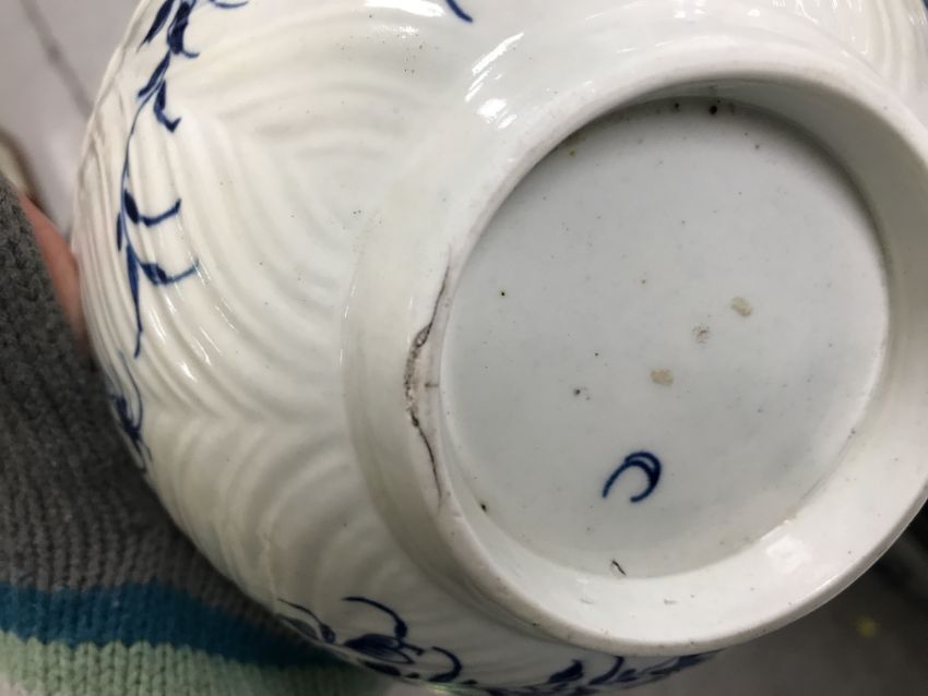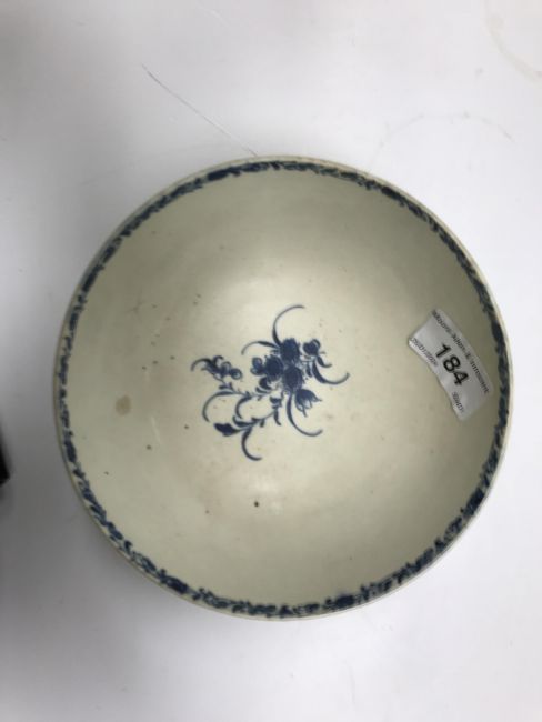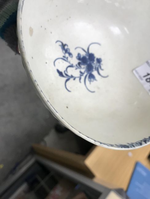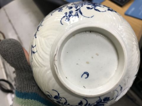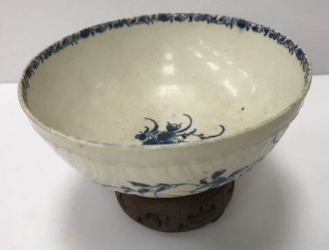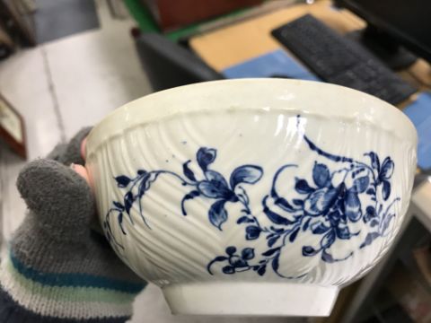An 18th Century Worcester blue and white and relief decorated floral spray painted bowl, bearing open C mark to base, 6.5 cm high x 14.5 cm diameter