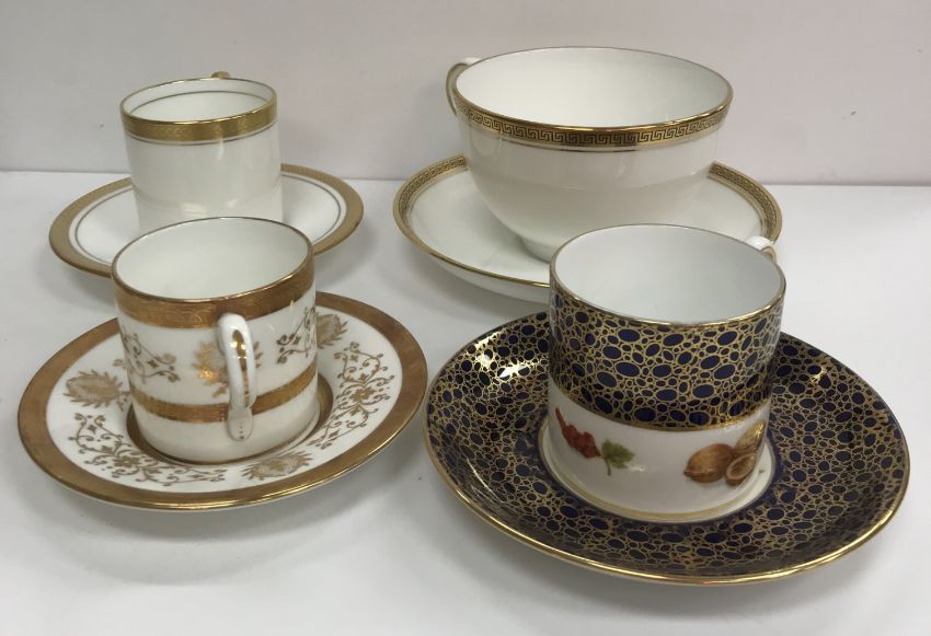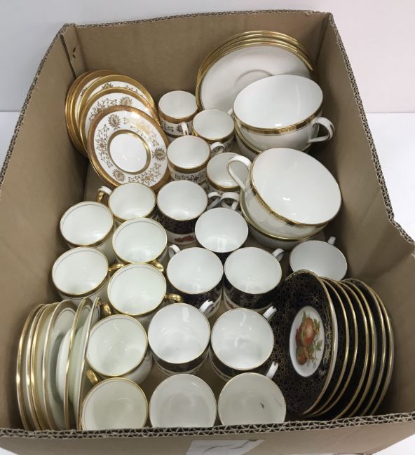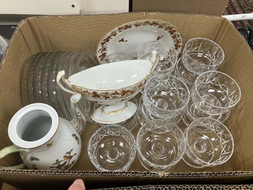 A box containing various Brierley, Stuart and other cut glass sundae dishes, Val St. Lambert and other salad plates, a Herend teapot (minus lid), a 19th Century Crown Derby boat-shaped tureen and matching circular plate, together with a box comprising Hammersley & Co bone china set of nine coffee cans and seven saucers with printed fruit decoration, an Aynsley set of seven Elizabeth pattern gilt foliate banded coffee cans and six saucers, a set of four Coalport Lady Anne gilt decorated coffee cans with seven saucers and a Hammersley set of four Greek key and gilt banded tea cups and saucers (2 boxes)