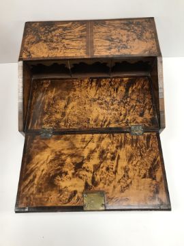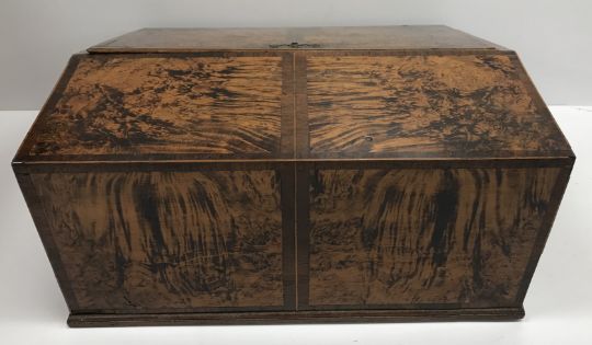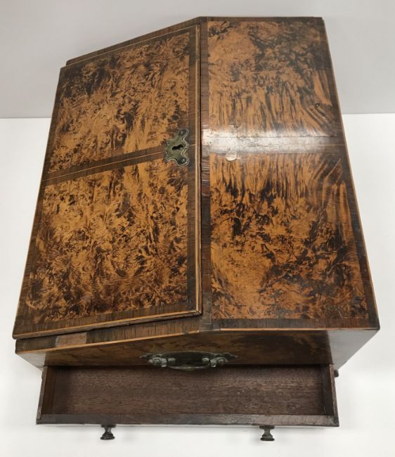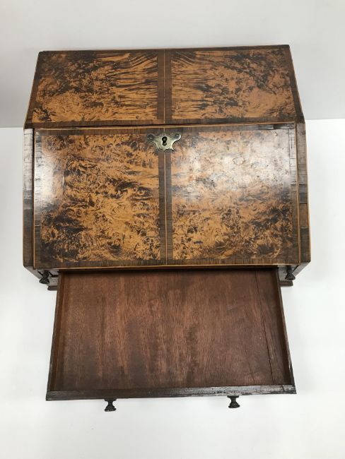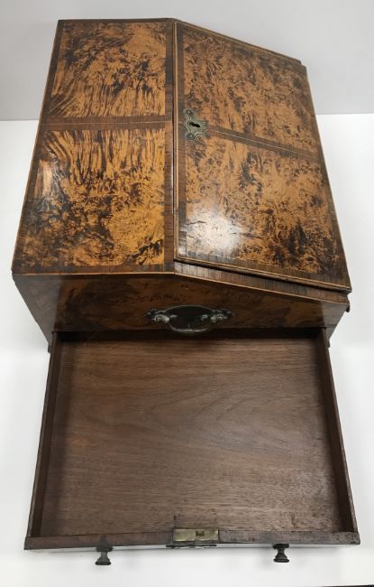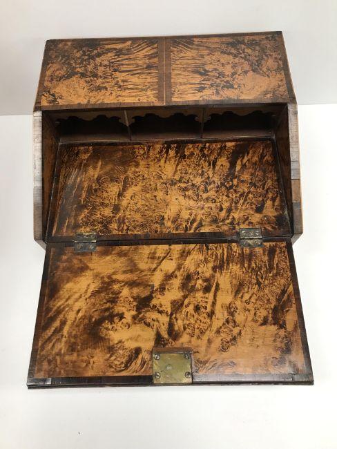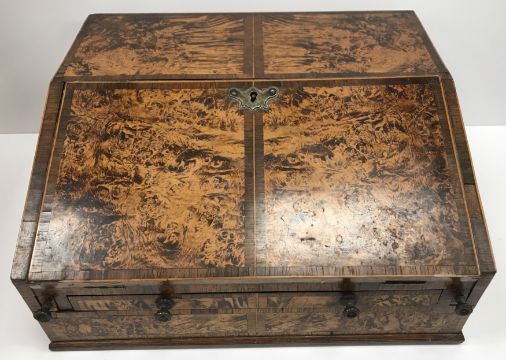 A 19th Century faux mulberry and rosewood banded writing slope of bureau type form, the fall front opening to reveal a fitted interior above a single drawer to front and two side drawers, set with brass carry handles, 36 cm wide x 31 cm deep x 16.5 cm high