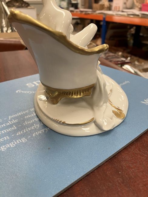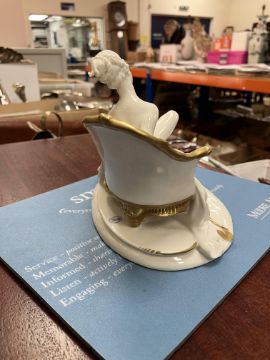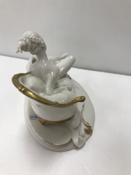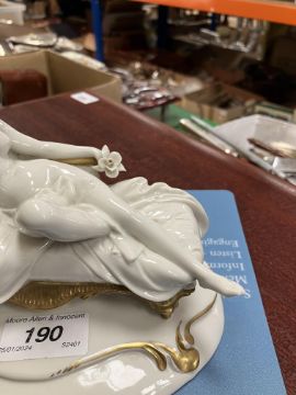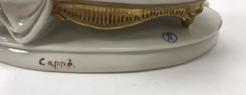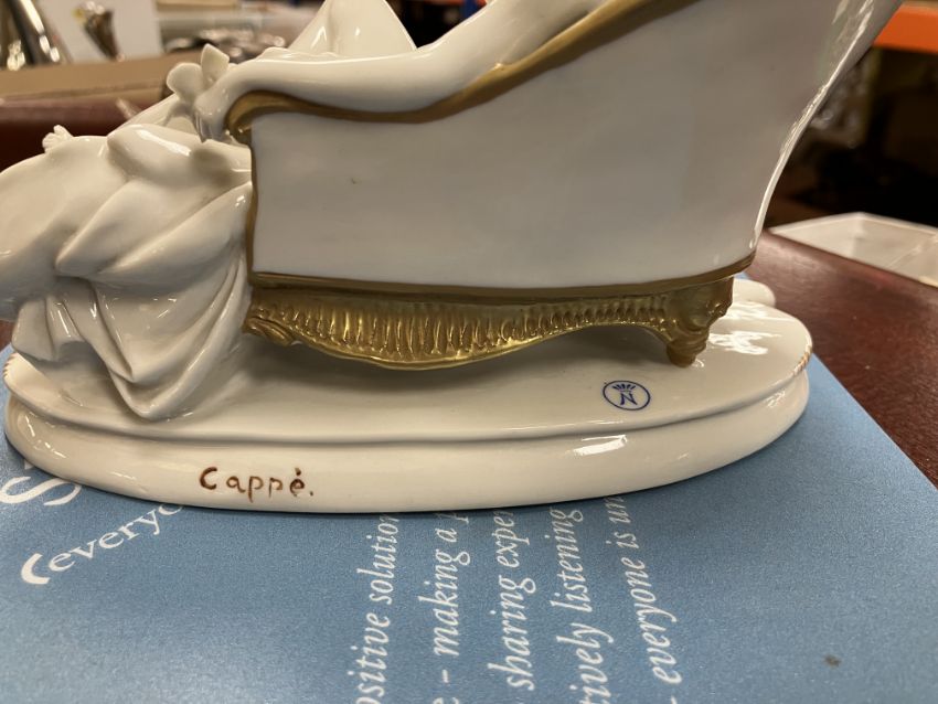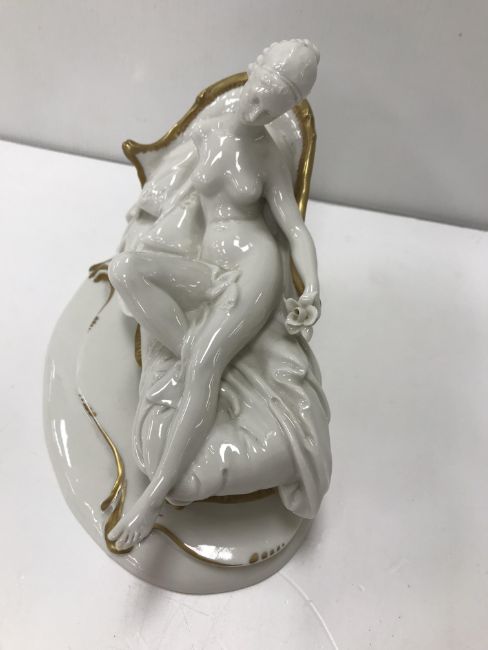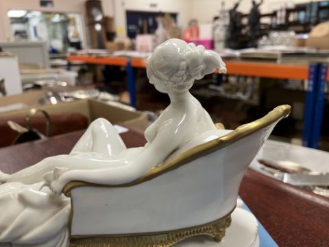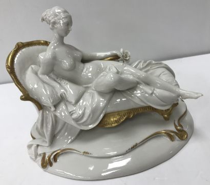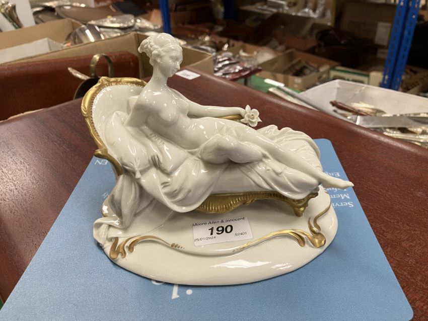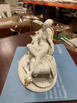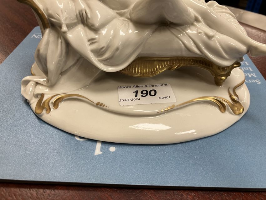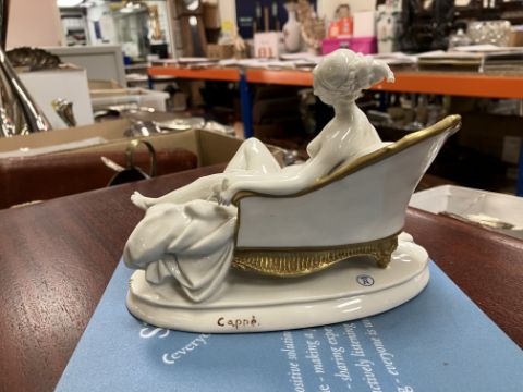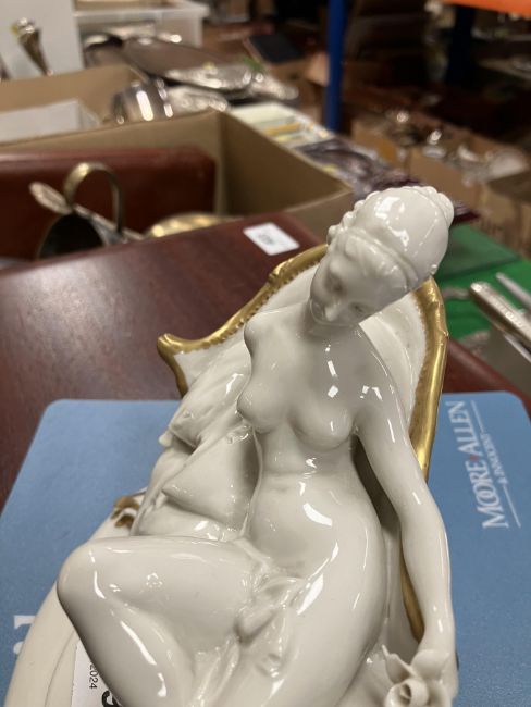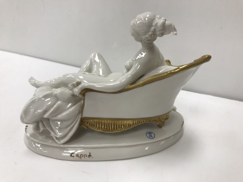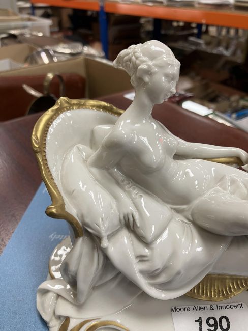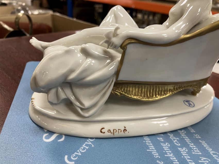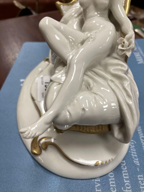 A 20th Century Giuseppe Cappe gelle Capo di Monte figure of a nude seated upon a chaise longue with gilt highlights 12.5 cm high