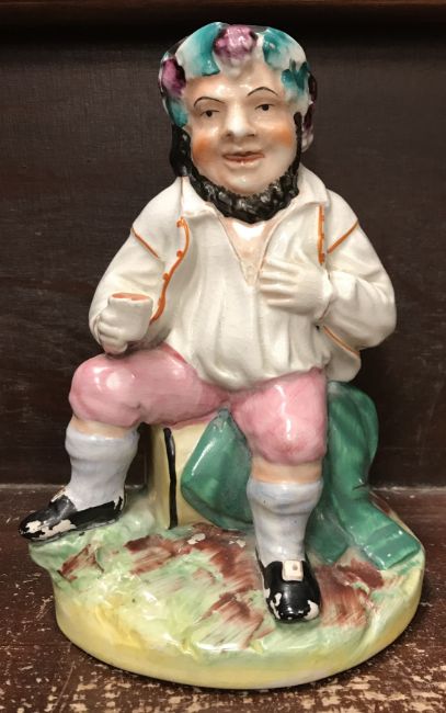 A 19th Century Staffordshire pottery figure of Bacchus seated upon a barrel, a beaker in his hand, 16 cm high