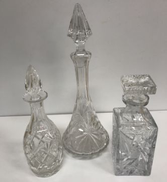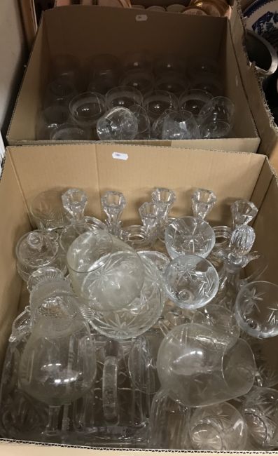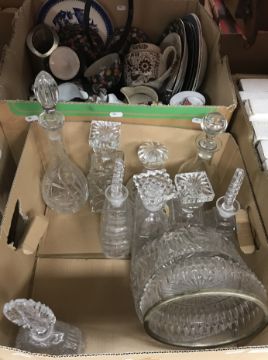 A box containing various decanters and fruit bowls, together with two boxes of assorted wine glasses, etc. and a box of assorted china wares, to include a Phoenix China part tea set (4 boxes)
