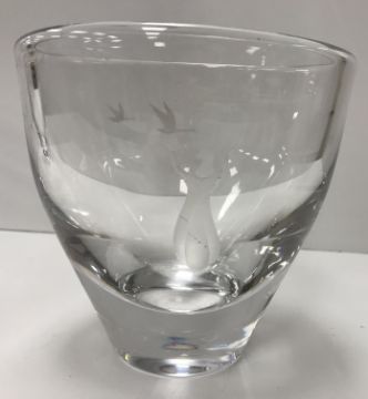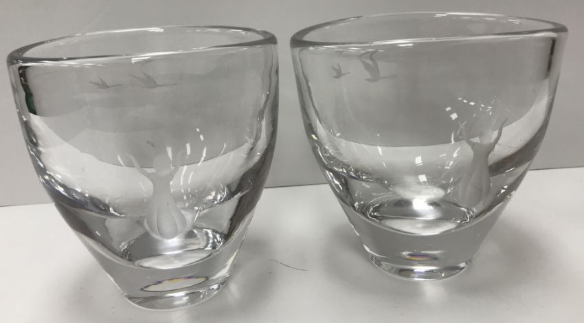 A pair of mid 20th Century Orrefors style vases, each engraved with young girl with her arms raised and two swans, indistinctly signed to base, 13 cm high