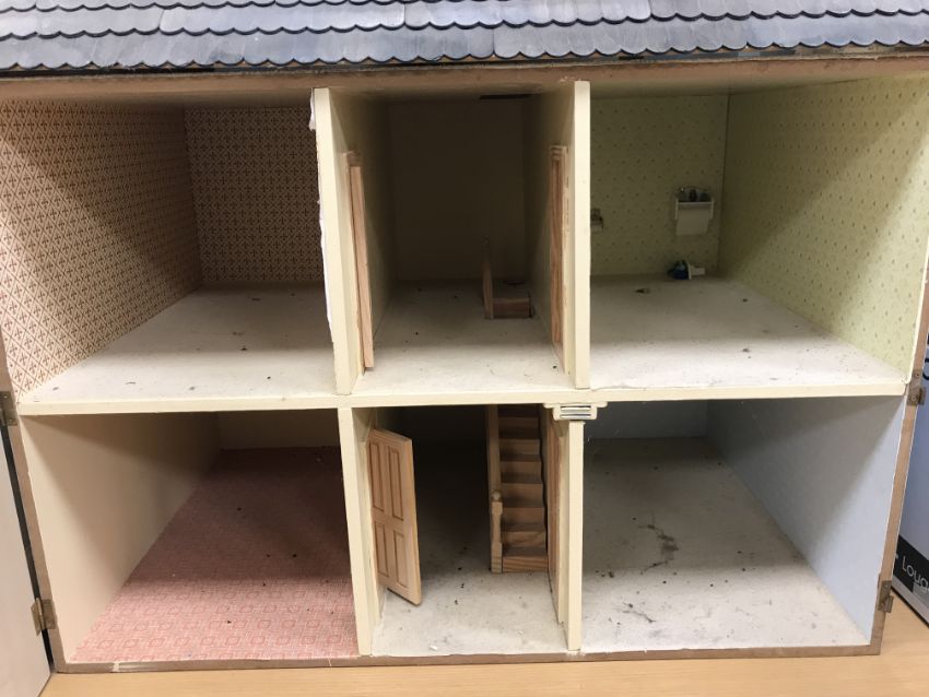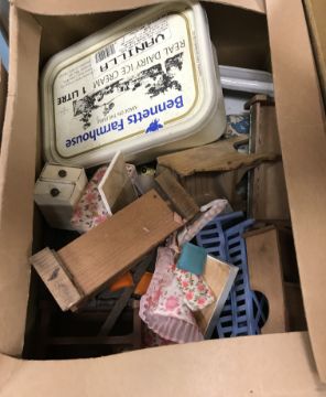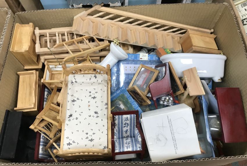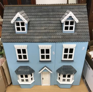 A modern dolls' house, the blue front opening to reveal an unfitted interior, together with two boxes of assorted dolls' house furniture, etc.