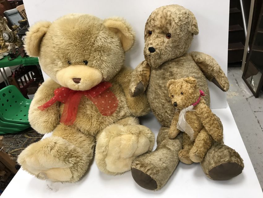A vintage gold plush teddy bear with stitched nose and mouth and glass eyes 75 cm long together with another similar smaller teddy bear 31 cm long and a modern polyester filled teddy bear with stitched nose and glass eyes 75 cm long