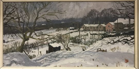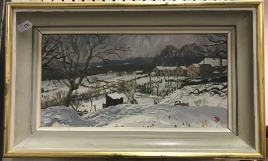 JOHN DOYLE (B. 1928) “Fall of snow, Forest of Dean” a study of houses in winter, oil on board, monogrammed lower right, inscribed on label verso 17.5 cm x 32.5 cm (ARR)