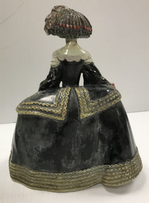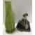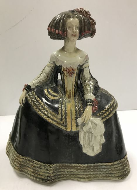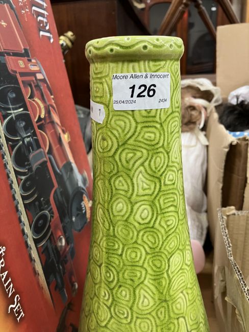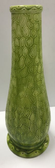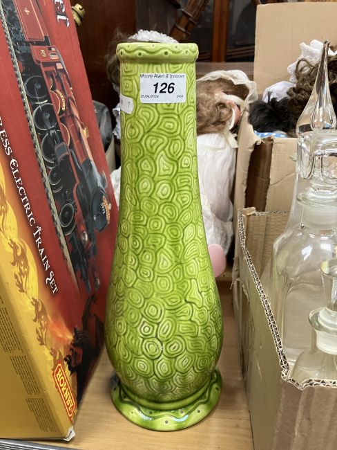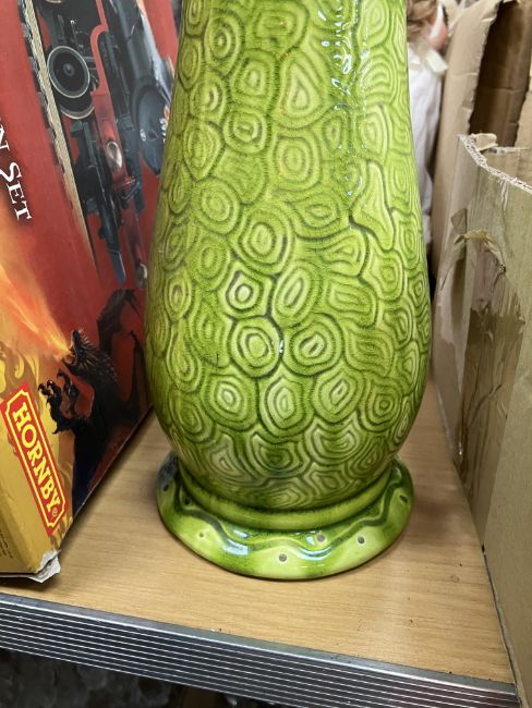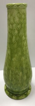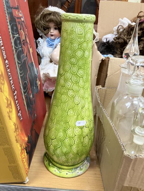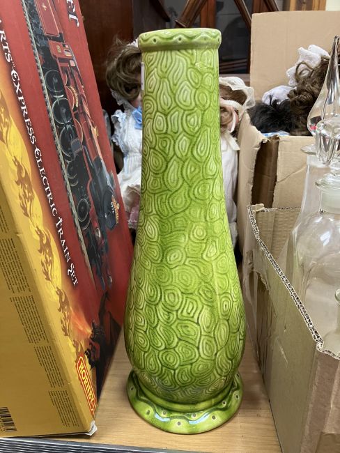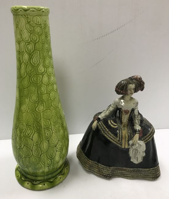 A Burmantofts faience green glazed incised baluster shaped vase on circular foot, stamped and No'd, to base "1400", 37.5 cm high, together with a glazed potter figure of "Queen Maria Anna of Spain", with blue over glazed mark to base "P.S.T." around a central "O", 25 cm high