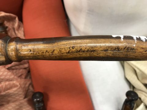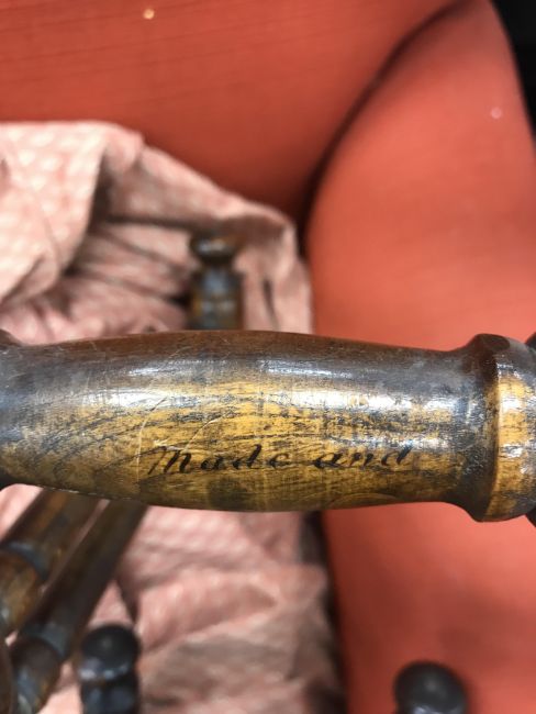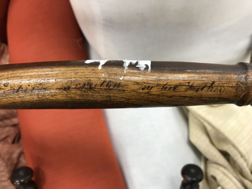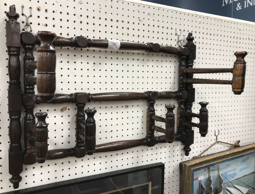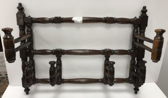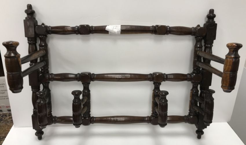 A rare 19th Century laburnum alpinum wall-mounted wig rack of six turned and ringed folding hooks, on a turned rack frame, bearing pen and ink inscription to the rear of the top rail "Made and presented to Edith Scruton by her father May 22nd 1875" 60 cm wide x 45 cm high x 25.5 cm high