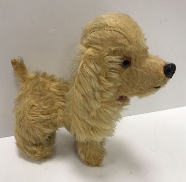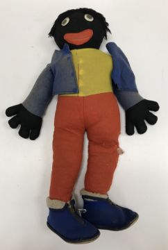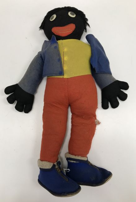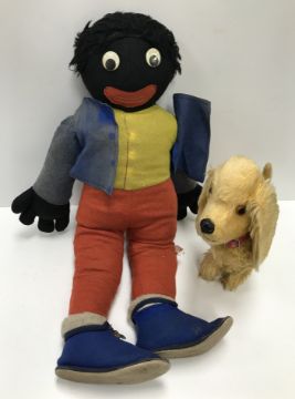 A felt covered soft "Golly" toy, 57 cm high and a Pedigree gold plush dog figure, 27 cm high