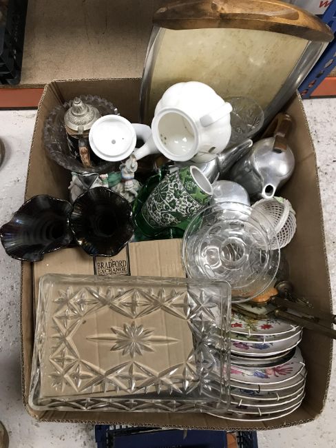 A box containing a piquot ware tea set, pair of carnival glass type vases, various collectors' plates, ornaments, etc, together with 20TH CENTURY ENGLISH SCHOOL "Woodland with river and footbridge", oil on canvas, unsigned, 51 cm x 92 cm (1 box and 1 painting)