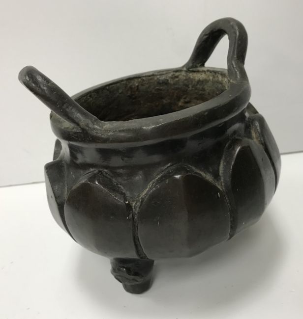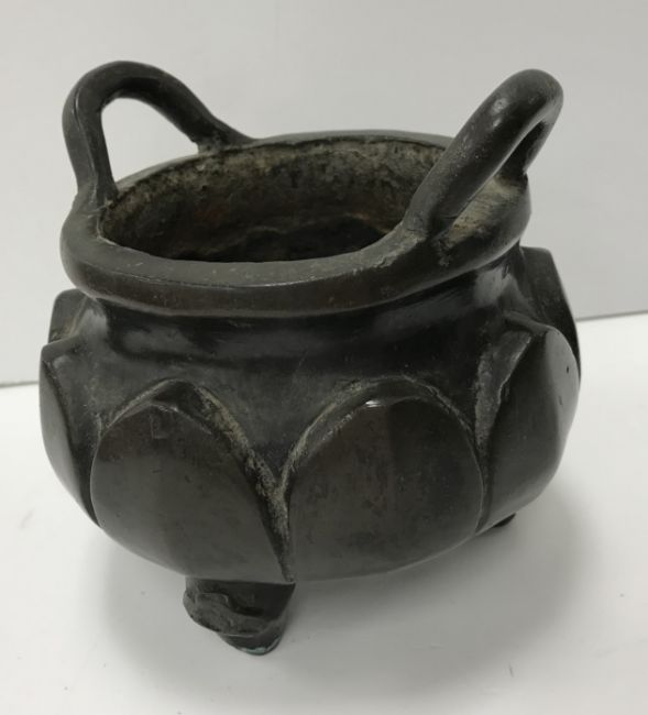 A Chinese patinated bronze censor with two plain loop handles, the main bellied body with lotus leaf decoration raised on three ruyi fungus decorated feet 15 cm diameter x 14 cm high, 2312 g