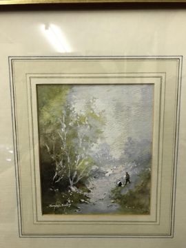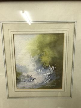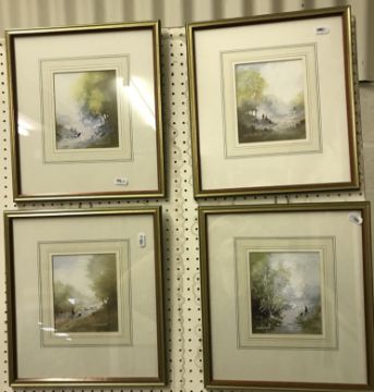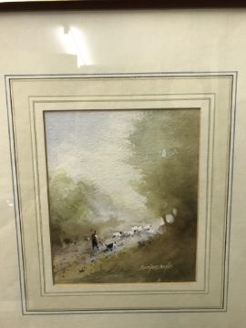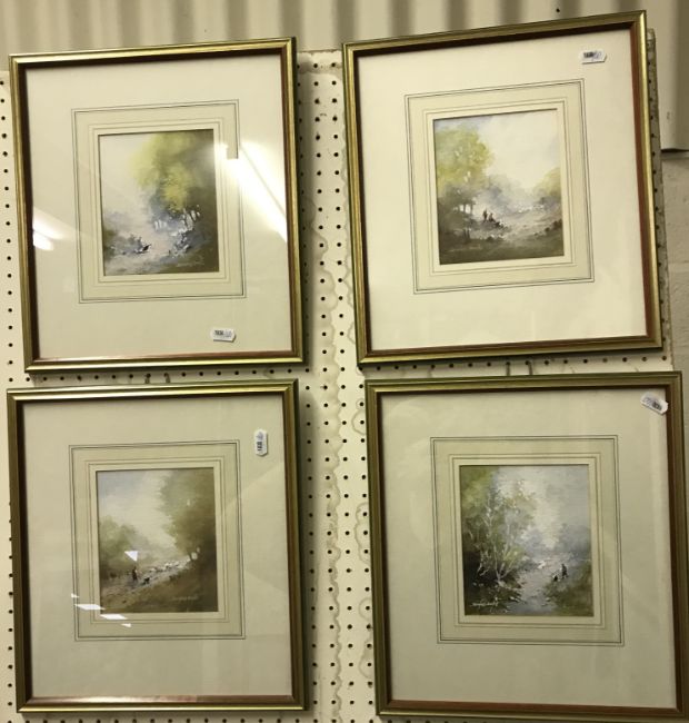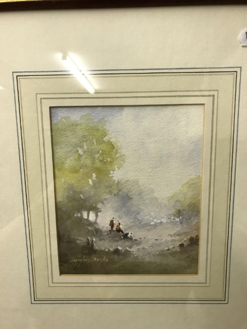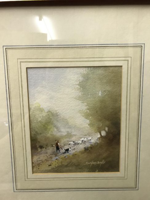 BERNARD BANKS "Shepherd with a sheepdog and sheep in a valley landscape", watercolour heightened in white, signed lower right, 15 cm x 12.5 cm, together with three others by the same hand (4)