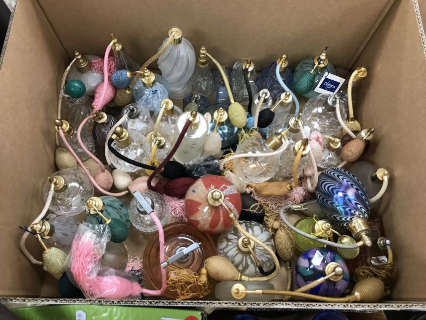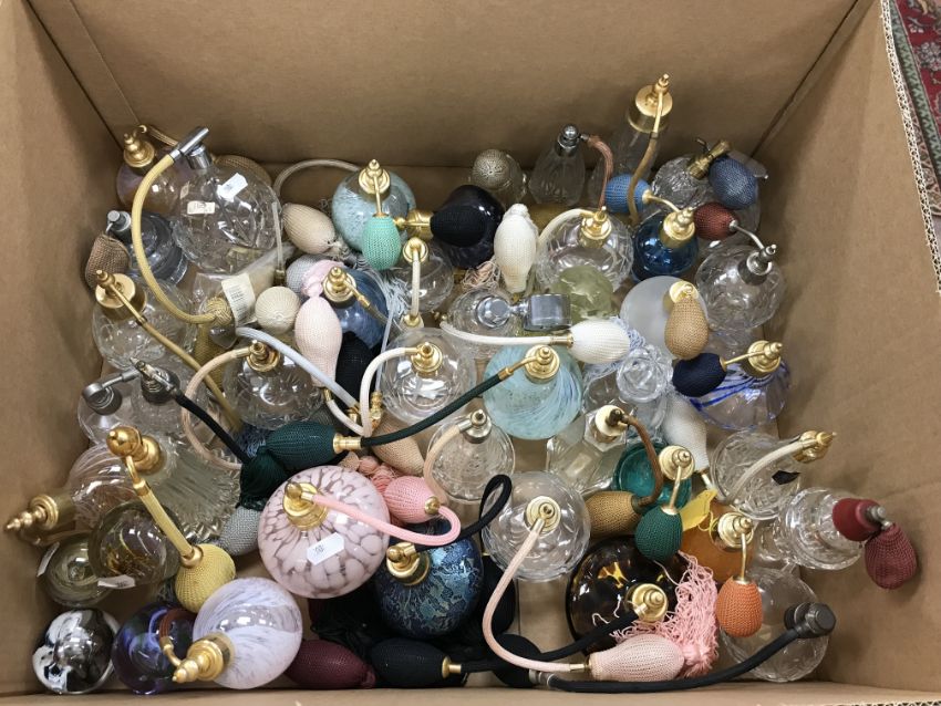 A collection of approx. eighty various clear and coloured glass scent atomizers including Isle of Wight, Caithness and others various together with four various small paperweights including one Isle of Wight and three Caithness